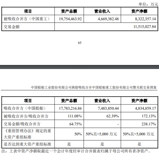 本次交易构成重大资产重组。本次换股吸收合并中,中国船舶拟购买资产的交易金额为换股吸收合并中国重工的成交金额(交易金额=中国重工换股价格×中国重工总股本),为11,515,027.84万元。