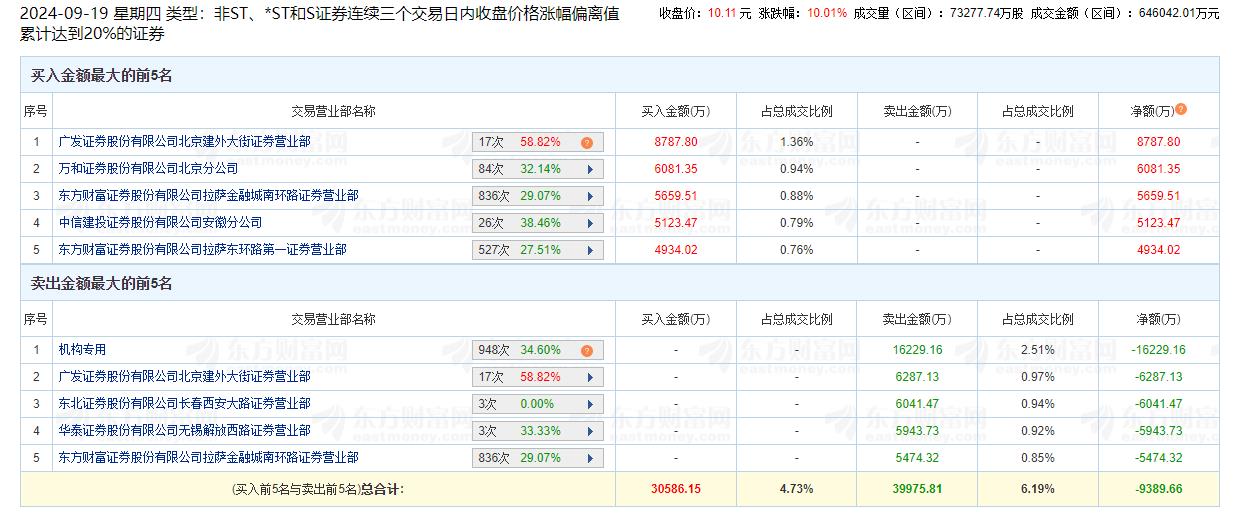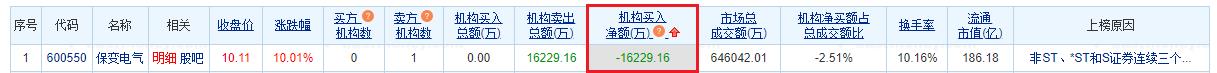 龙虎榜数据显示,作为非ST、*ST和S证券连续三个交易日内收盘价格涨幅偏离值累计达到20%的证券,保变电气卖出金额最大的前五名中,有1家机构专用席位。经统计,保变电气的机构席位三个交易日净卖出金额为16229.16万元。