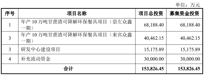 众鑫股份本次发行募集资金总额67,733.21万元,扣除发行费用(不含税)后的募集资金净额为57,075.44万元。公司最终募集资金净额比原计划少96,751.01万元。众鑫股份2024年9月12日披露的招股书显示,公司拟募集资金153,826.45万元,用于年产10万吨甘蔗渣可降解环保餐具项目(崇左众鑫一期)、年产10万吨甘蔗渣可降解环保餐具项目(来宾众鑫一期)、研发中心建设项目、补充流动资金。