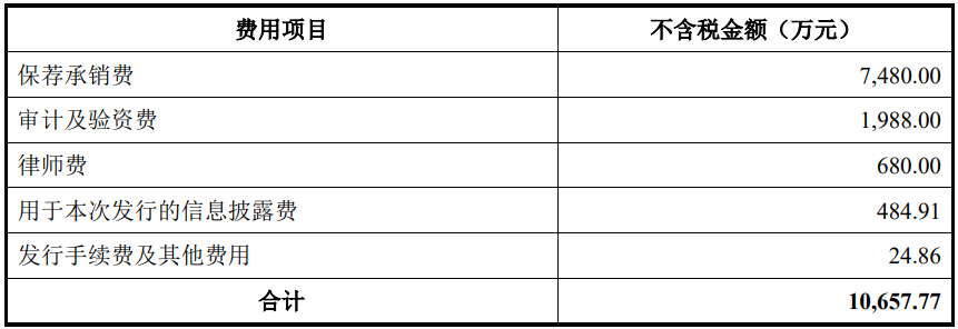 众鑫股份本次公开发行新股的发行费用合计10,657.77万元(不含税),其中保荐承销费为7,480.00万元。