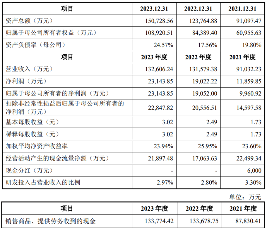 上述同期,公司销售商品、提供劳务收到的现金分别为87,830.41万元、133,678.75万元和133,774.42万元,经营活动产生的现金流量净额分别为22,499.34万元、17,063.63万元和21,897.48万元。