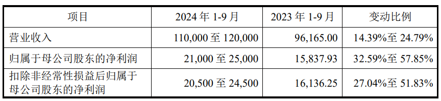 根据目前经营情况,公司预计2024年1-9月营业收入为110,000万元至120,000万元,变动比例14.39%至24.79%;归属于母公司股东的净利润21,000万元至25,000万元,变动比例32.59%至57.85%;扣除非经常性损益后归属于母公司股东的净利润20,500万元至24,500万元,变动比例27.04%至51.83%。