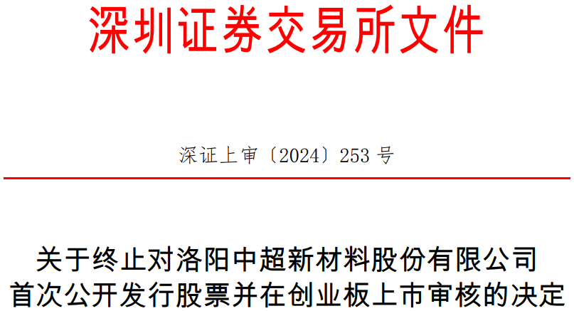 中国经济网北京9月23日讯 证监会网站9月20日披露关于终止对洛阳中超新材料股份有限公司(简称“中超股份”)首次公开发行股票并在创业板上市审核的决定。