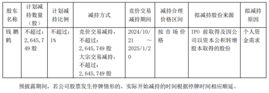 据移远通信公告,公司控股股东钱鹏鹤因个人资金需求原因,拟通过集中竞价、大宗交易方式减持其所持有的公司股份,合计不超过2,645,749股,占公司总股本的1%。本次减持计划自本公告披露之日起15个交易日后的3个月内实施,且在任意连续90日内,以集中竞价交易方式或大宗交易方式减持的股份数量均不超过公司总股本的1%。