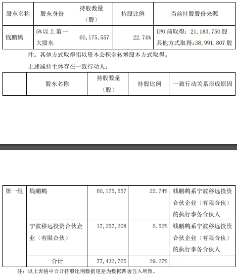 截至公告披露日,钱鹏鹤直接持有公司股份60,175,557股,占公司总股本的比例为22.74%。