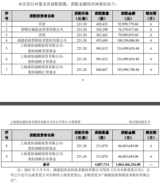 经中国证券监督管理委员会下发的证监许可[2021]174号《关于核准上海移远通信技术股份有限公司非公开发行股票的批复》核准,公司向社会公开发行人民币普通股(A股)4,807,714股,发行价格为221.20元/股,募集资金总额为人民币1,063,466,336.80元,扣除发行费用2,610,195.96元(不含税),实际募集资金净额为1,060,856,140.84元。其中增加股本人民币4,807,714.00元,增加资本公积人民币1,056,048,426.84元。上述募集资金已于2021年3月12日到账。 本次发行对象共9名。本次定增的保荐机构(主承销商)是招商证券,保荐代表人是杨华伟、刘旺梁。