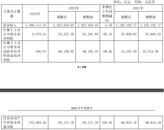 2023年,移远通信实现营业收入1,386,117.51万元,同比下降2.59%;归属于上市公司股东的净利润9,070.61万元,同比下降85.43%;归属于上市公司股东的扣除非经常性损益的净利润566.91万元,同比下降98.82%;经营活动产生的现金流量净额103,684.26万元,同比增长106.66%。