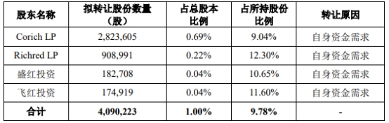 据天德钰公告,拟参与天德钰首发前股东询价转让的股东为Corich LP、Richred LP、盛红投资、飞红投资(上述4家股东以下合称“出让方”);l出让方拟转让股份的总数为4,090,223股,占上市公司总股本的比例为1.00%。