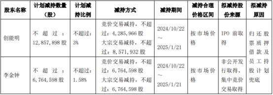 公司控股股东创能明及其一致行动人、实际控制人李金钟拟通过上海证券交易所交易系统以集中竞价、大宗交易的方式减持公司股份不超过19,622,496股,即减持不超过公司股份总数的4.58%,并在减持计划披露之日起15个交易日后的3个月内进行,减持价格按照减持实施时的市场价格确定。其中,创能明采取集中竞价方式减持时,在任意连续90日内,减持股份的总数不超过公司总股本的1%;创能明采取大宗交易方式减持时,在任意连续90日内,减持股份的总数不超过公司总股本的2%。李金钟通过集中竞价方式、大宗交易方式减持的股份总数不超过公司总股本的1.58%。