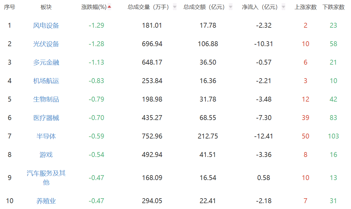 板块方面,贵金属、煤炭开采加工、银行板块涨幅居前,风电设备、光伏设备板块跌幅居前。