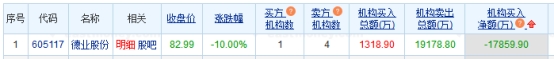 德业股份跌停 机构净卖出1.79亿元