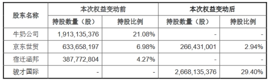 永辉超市昨日晚间披露公告称,公司股东牛奶有限公司(以下简称“牛奶公司”)、北京京东世纪贸易有限公司(以下简称“京东世贸”)和宿迁涵邦投资管理有限公司(以下简称“宿迁涵邦”,系京东世贸的一致行动人)拟通过协议转让的方式向广东骏才国际商贸有限公司(以下简称“骏才国际”)分别转让其所持有的永辉超市1,913,135,376股股份、367,227,196股股份和387,772,804股股份,分别占公司总股本的21.08%、4.05%和4.27%。
