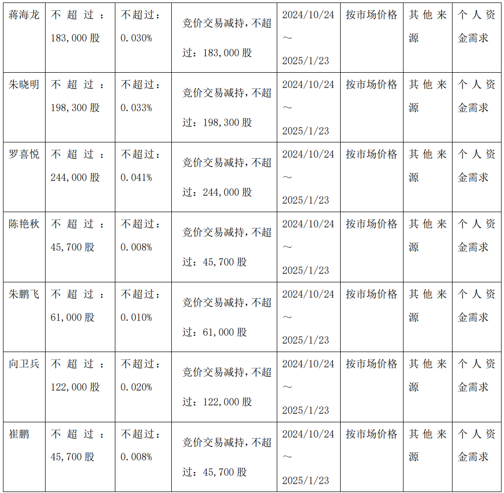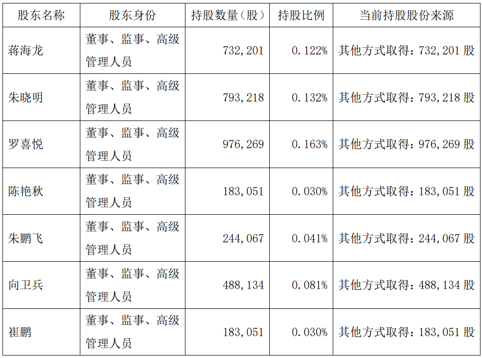 截至公告披露日,公司董事蒋海龙持有公司股份732,201股,占公司总股本的比例为0.122%;董事朱晓明持有公司股份793,218股,占公司总股本的比例为0.132%;董事兼副总经理罗喜悦持有公司股份976,269股,占公司总股本的比例为0.163%;监事陈艳秋持有公司股份183,051股,占公司总股本的比例为0.030%;监事朱鹏飞持有公司股份244,067股,占公司总股本的比例为0.041%;副总经理向卫兵持有公司股份488,134股,占公司总股本的比例为0.081%;财务负责人崔鹏持有公司股份183,051股,占公司总股本的比例为0.030%。