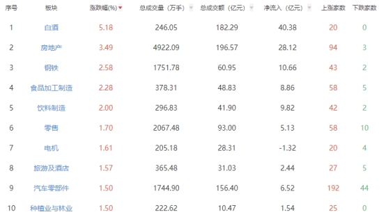 板块方面,白酒、房地产、钢铁等板块涨幅居前,软件开发、贵金属、医疗服务等板块跌幅居前。