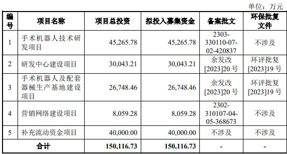 键嘉医疗原拟在上交所科创板公开发行股票不超过2,000.0000万股(不含采用超额配售选择权发行的股票数量),原拟募集资金150,116.73万元,计划用于手术机器人技术研发项目、研发中心建设项目、手术机器人及配套器械生产基地建设项目、营销网络建设项目、补充流动资金项目。