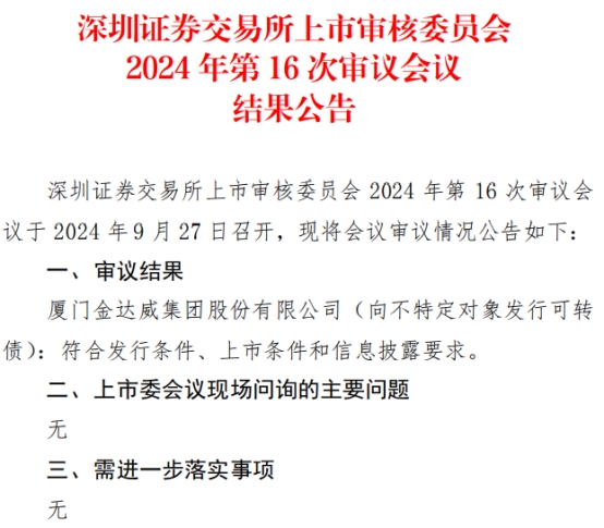中国经济网北京9月28日讯 深交所上市审核委员会2024年第16次审议会议于2024年9月27日召开,审议结果显示,厦门金达威集团股份有限公司(以下简称“金达威”,002626.SZ)向不特定对象发行可转债符合发行条件、上市条件和信息披露要求。