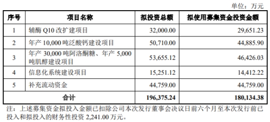 金达威2024年9月20日披露的向不特定对象发行可转换公司债券募集说明书(上会稿)显示,公司本次向不特定对象发行可转换公司债券募集资金总额不超过180,134.38万元(含本数),扣除发行费用后的募集资金净额拟投资于以下项目:辅酶Q10改扩建项目、年产10,000吨泛酸钙建设项目、年产30,000吨阿洛酮糖、年产5,000吨肌醇建设项目、信息化系统建设项目和补充流动资金。
