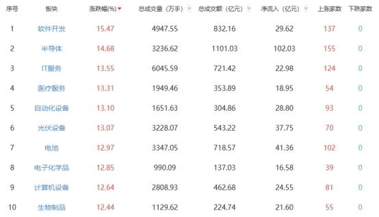 板块方面,软件开发、半导体、IT服务等涨幅靠前。