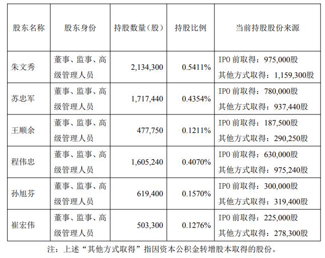董事、副总经理王顺余持有公司股份477,750股,占公司总股本的0.1211%;董秘程伟忠持有公司股份1,605,240股,占公司总股本的0.4070%。
