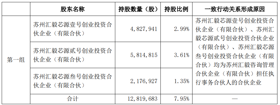 汇毅芯源壹号持有公司股份4,827,941股,占公司股份总数的2.99%;汇毅芯源贰号持有公司股份5,814,815股,占公司股份总数的3.61%;汇毅芯源叁号持有公司股份2,176,927股,占公司股份总数的1.35%。上述股东均为苏州汇毅咨询管理合伙企业(有限合伙)担任执行事务合伙人的合伙企业,构成一致行动关系,合并计算后持有公司股份12,819,683股,占公司股份总数的7.95%。上述股份为公司首次公开发行上市前及资本公积转增股本取得的股份,已于2024年6月25日起上市流通。