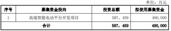 江淮汽车9月30日晚间披露的2024年度向特定对象发行A股股票预案显示,公司本次向特定对象发行股票的募集资金总额不超过490,000万元(含本数),扣除发行费用后募集资金将全部用于以下项目:高端智能电动平台开发项目。