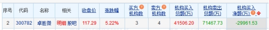 龙虎榜数据显示,卓胜微为连续三个交易日内,涨幅偏离值累计达到30%的证券,买入该股金额最大的前5名中,3家为机构专用席位。卖出该股金额最大的前5名中,4家为机构专用席位。经统计,机构席位三个交易日卖出卓胜微净额为29,961.53万元。