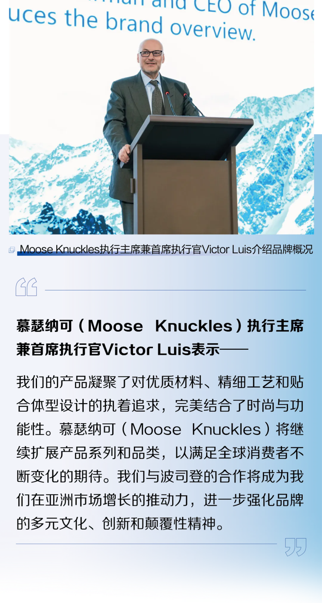 凯辉基金管理合伙人段兰春表示,在当前快速变化的市场中,消费者对品质和个性化设计的要求不断提升。我们相信Moose Knuckles凭借其独特的品牌定位和卓越的工艺,将在全球市场中取得更大的成功。通过与波司登的战略合作,我们将充分发挥双方优势,共同推动品牌在亚太地区的增长。期待此次合作为双方开辟新的市场前景,并激发更多的创新可能。