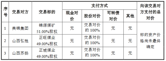 美锦能源拟通过发行股份的方式购买美锦能源集团有限公司(简称:美锦集团)持有的临县锦源煤矿有限公司(简称:锦源煤矿)51%股权、山西弘弛鼎盛投资有限公司(简称:山西弘弛)持有的山西汾西正旺煤业有限责任公司(简称:正旺煤业)49%股权、山西苏扬鼎盛矿业投资有限公司(简称:山西苏扬)持有的山西汾西正城煤业有限责任公司(简称:正城煤业)49%股权,本次交易不涉及募集配套资金。