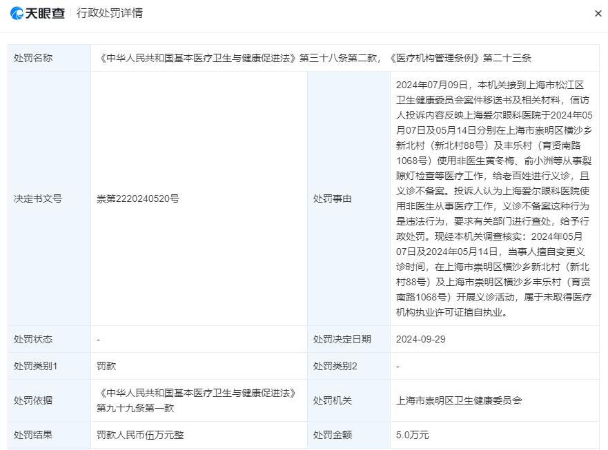 天眼查APP显示,2024年7月9日,上海市崇明区卫生健康委员会接到上海市松江区卫生健康委员会案件移送书及相关材料,信访人投诉内容反映上海爱尔眼科医院于2024年5月7日及5月14日分别在上海市崇明区横沙乡新北村(新北村88号)及丰乐村(育贤南路1068号)使用非医生黄冬梅、俞小洲等从事裂隙灯检查等医疗工作,给老百姓进行义诊,且义诊不备案。投诉人认为上海爱尔眼科医院使用非医生从事医疗工作,义诊不备案这种行为是违法行为,要求有关部门进行查处,给予行政处罚。