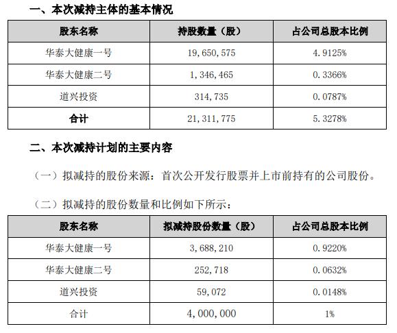华泰大健康合计持有公司21,311,775股(占公司总股本的比例为5.3278%),计划自公告披露之日起十五个交易日后的三个月内,以集中竞价交易方式减持的股份数量不超过4,000,000股(占公司总股本的比例为1%)。