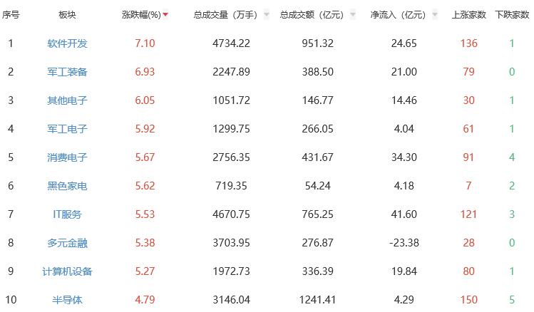 板块方面,软件开发、军工装备、其他电子、军工电子、消费电子等涨幅居前。