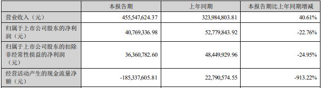 据广联航空2024年半年度报告,2024年上半年,公司实现营业收入4.56亿元,同比增长40.61%;归属于上市公司股东的净利润4076.93万元,同比减少22.76%;归属于上市公司股东的扣除非经常性损益的净利润3636.08万元,同比减少24.95%;经营活动产生的现金流量净额为-1.85亿元。