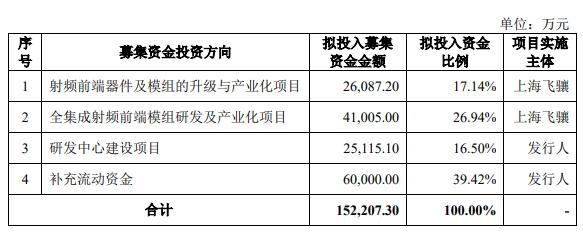 飞骧科技原拟募集资金152,207.30万元,用于射频前端器件及模组的升级与产业化项目、全集成射频前端模组研发及产业化项目 、研发中心建设项目、补充流动资金。