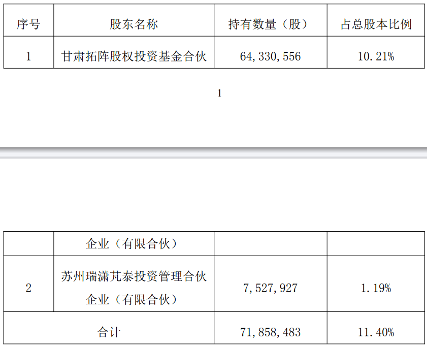 截至公告披露日,拓阵基金及其一致行动人瑞潇芃泰共计持有公司71,858,483股,占公司总股本的11.40%。