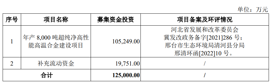 上大股份本次发行募集资金总额为63,961.07万元,扣除发行费用后的实际募集资金净额为54,850.33万元,公司最终募集资金净额比原计划少70,149.67万元。上大股份2024年10月11日披露的招股书显示,公司拟募集资金125,000.00万元,用于年产8,000吨超纯净高性能高温合金建设项目、补充流动资金。
