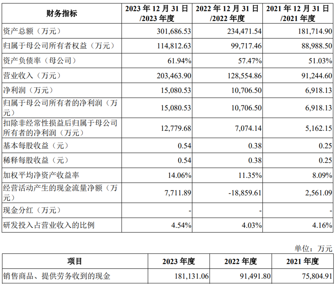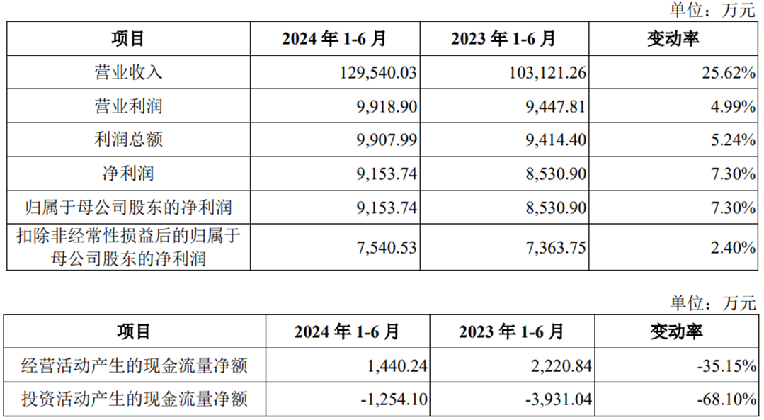 2024年1-6月,公司实现营业收入129,540.03万元,同比增长25.62%;实现净利润/归属于母公司股东的净利润9,153.74万元,同比增长7.30%;扣除非经常性损益后的归属于母公司股东的净利润7,540.53万元,同比增长2.40%;经营活动产生的现金流量净额1,440.24万元,同比下降35.15%。