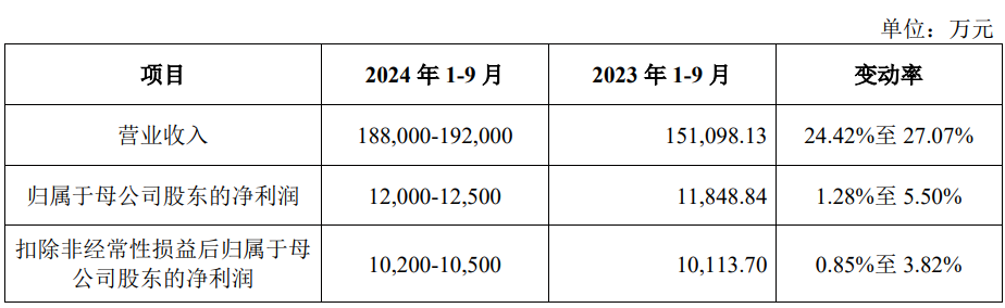 2024年1-9月,上大股份预计实现营业收入188,000万元至192,000万元,同比增长24.42%至27.07%;预计实现净利润12,000至12,500万元,同比增长1.28%至5.50%;扣除非经常性损益后归属于母公司股东的净利润10,200至10,500万元,同比增长0.85%至3.82%。