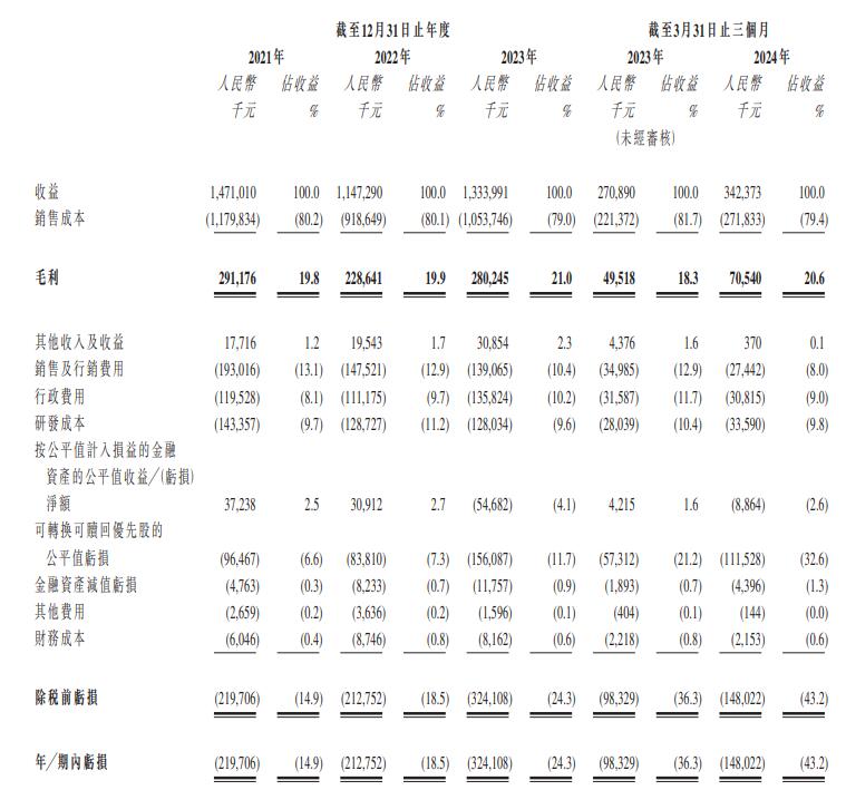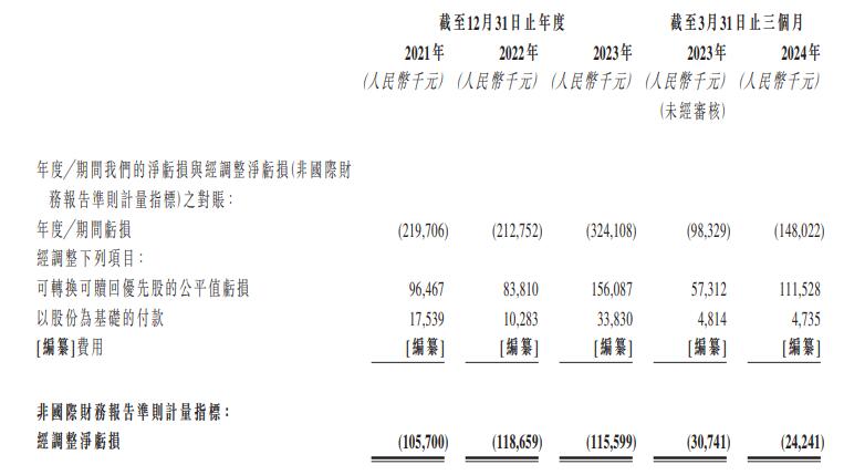 2021年、2022年、2023年、2024年1-3月,七牛智能的收益分别为14.71亿元、11.47亿元、13.34亿元、3.42亿元;期内亏损分别为2.20亿元、2.13亿元、3.24亿元、1.48亿元;经调整净亏损(非国际财务报告准则计量指标)分别为1.06亿元、1.19亿元、1.16亿元、0.24亿元。