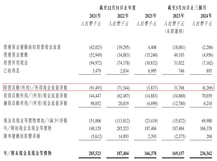 2021年、2022年、2023年、2024年1-3月,七牛智能经营活动所用现金净额分别为91,493千元、71,344千元、3,837千元、6,269千元。