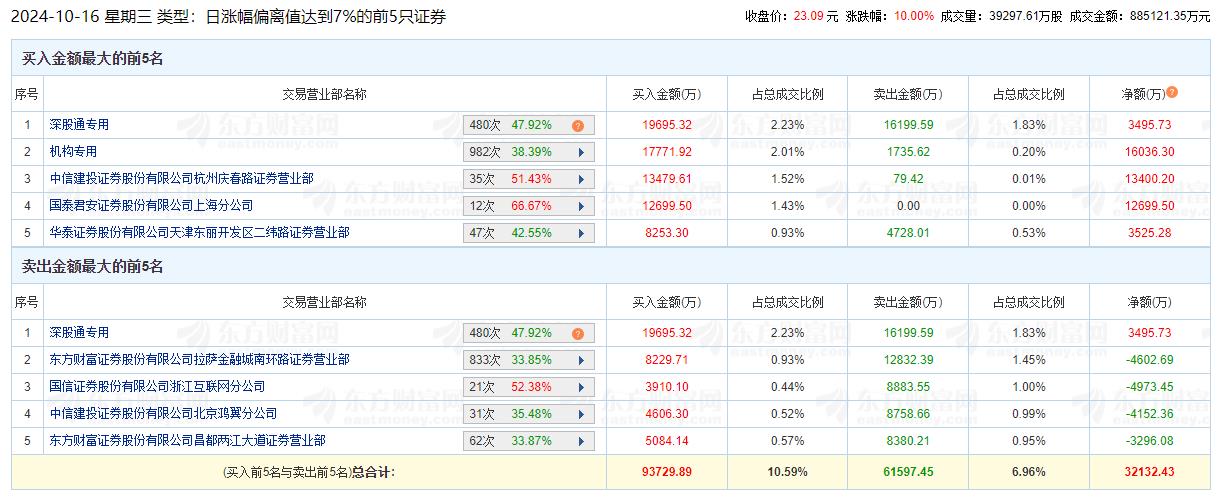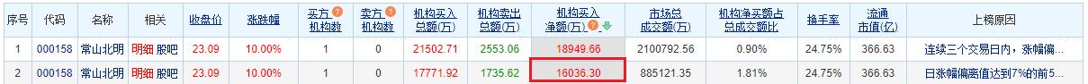 常山北明涨停 机构净买入1.6亿元