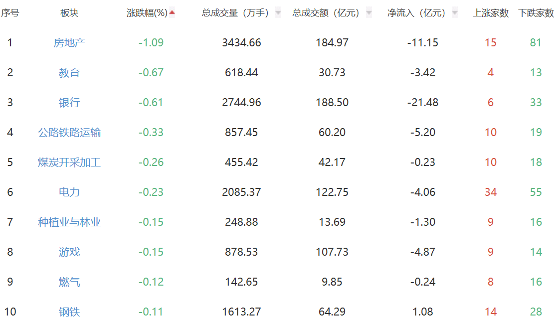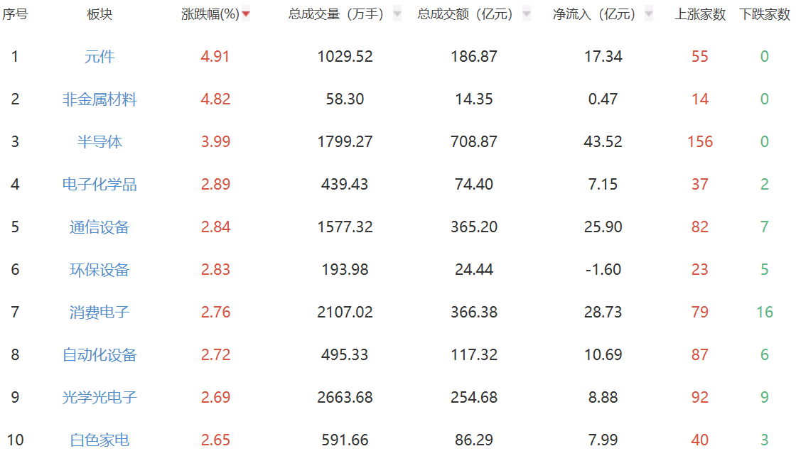 板块方面,元件、非金属材料、半导体板块涨幅居前,房地产、教育、银行板块跌幅居前。