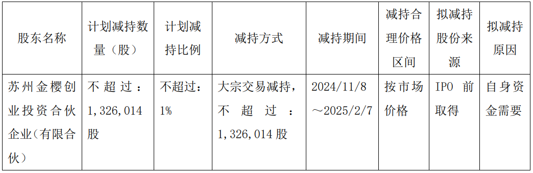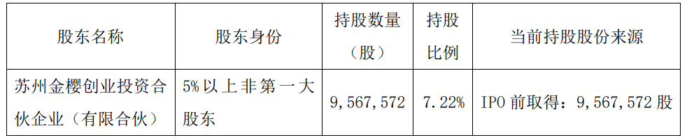 截至公告披露日,金樱创投持有公司股份9,567,572股,占公司当前总股本的7.22%。以上股份为公司首次公开发行前取得的股份,于2023年9月21日起解除限售上市流通。2023年9月13日,金樱创投出具《关于自愿延长限售股锁定期的承诺》,承诺将上述首次公开发行前取得的股份自愿延长锁定期6个月至2024年3月20日。