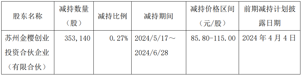 金樱创投最近一次减持思瑞浦的股份为2024年5月17日到2024年6月28日期间,减持353,140股,减持比例0.27%,减持价格区间为85.80元/股至115.00元/股。
