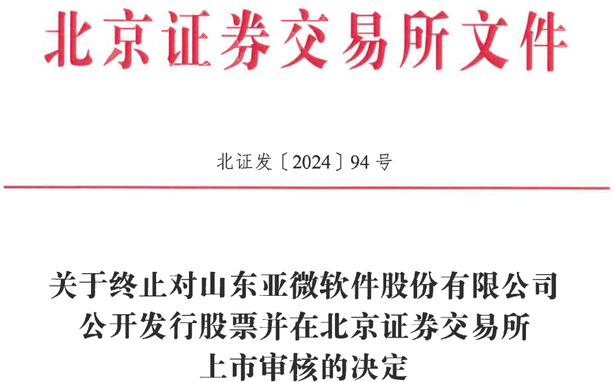 2024年9月20日,亚微软件向北交所提交了《山东亚微软件股份有限公司关于撤回向不特定合格投资者公开发行股票并在北京证券交易所上市申请文件的申请》,申请撤回申请文件。根据《北京证券交易所向不特定合格投资者公开发行股票并上市审核规则》第五十五条的有关规定,北交所决定终止亚微软件公开发行股票并在北京证券交易所上市的审核。