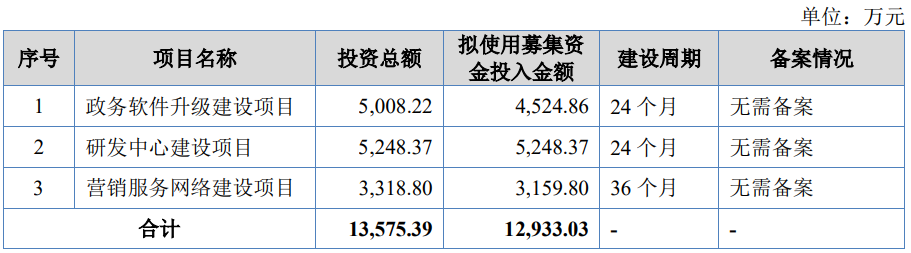 亚微软件原拟募集资金12,933.03万元,用于政务软件升级建设项目、研发中心建设项目、营销服务网络建设项目。