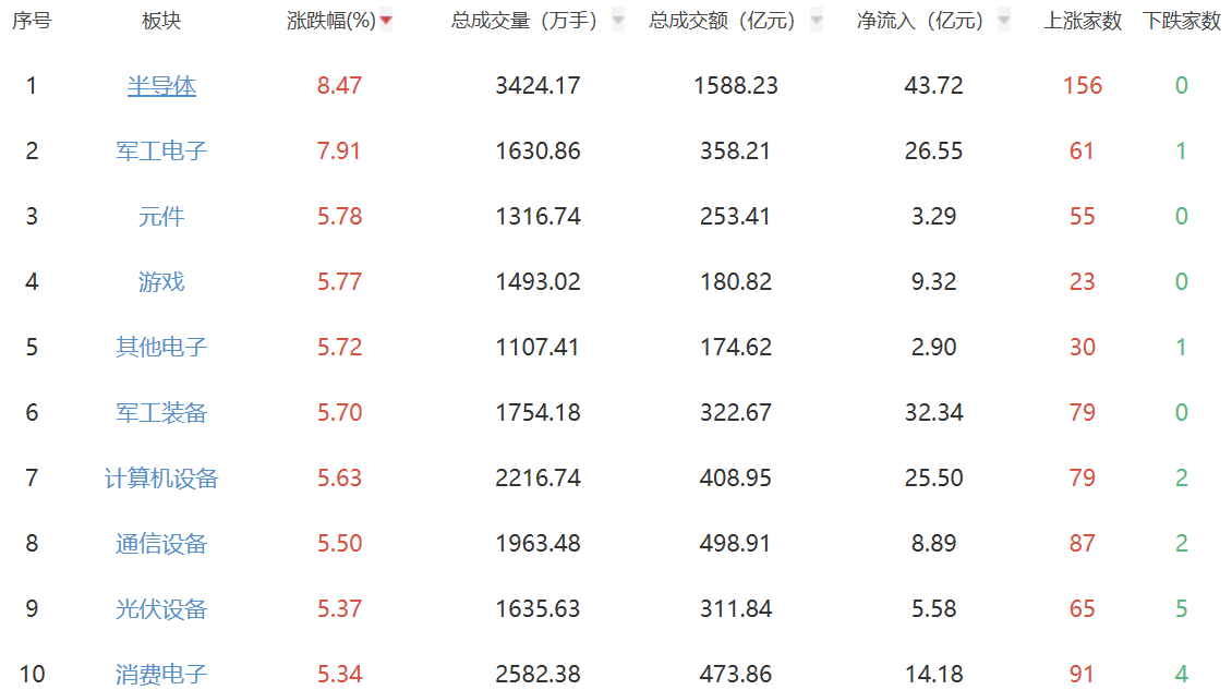 板块方面,半导体、军工电子板块涨幅居前,银行、证券、钢铁板块跌幅居前。