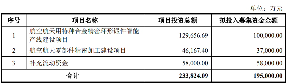 派克新材2023年8月17日披露的向不特定对象发行可转换公司债券募集说明书(修订稿)显示,公司拟可转债发行总额不超过人民币195,000.00万元(含195,000.00万元),扣除发行费用后,将全部投资于航空航天用特种合金精密环形锻件智能产线建设项目、航空航天零部件精密加工建设项目、补充流动资金。