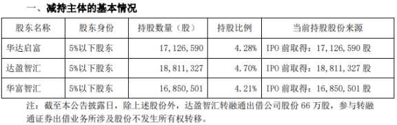 因自身资金需求,公司股东达盈智汇拟在减持计划披露的减持期间内,通过集中竞价交易或大宗交易的方式减持合计不超过2,350,000股的公司股份,减持股份占公司总股本的比例不超过0.5875%。