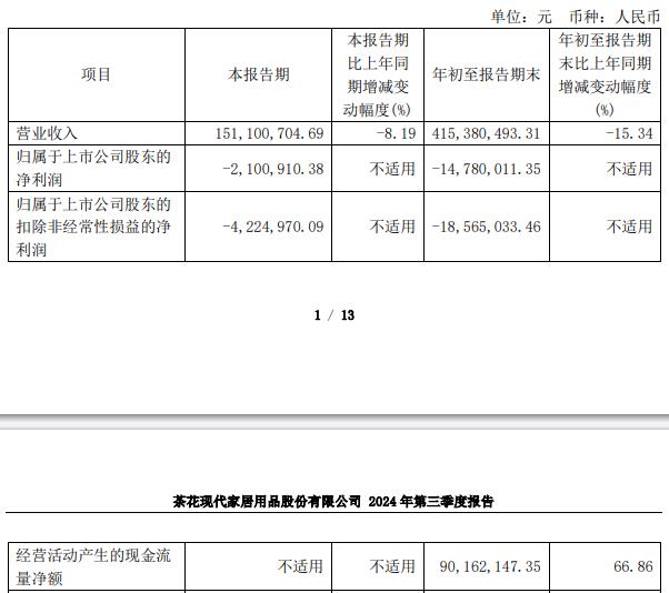 2024年前三季度,茶花股份实现营业收入4.15亿元,同比下滑15.34%;归属于上市公司股东的净利润-1478.00万元;归属于上市公司股东的扣除非经常性损益的净利润-1856.50万元;经营活动产生的现金流量净额为9016.21万元,同比增长66.86%。