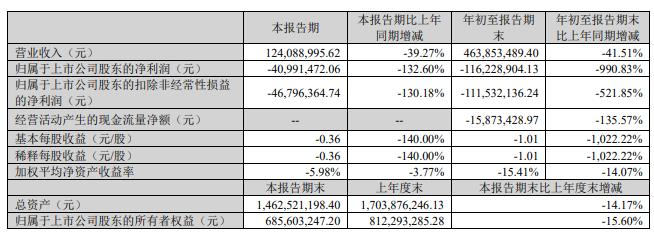 2024年前三季度,凯龙高科实现营业收入4.64亿元,同比下滑41.51%;归属于上市公司股东的净利润-1.16亿元;归属于上市公司股东的扣除非经常性损益的净利润-1.12亿元;经营活动产生的现金流量净额为-1587.34万元,同比下滑135.57%。